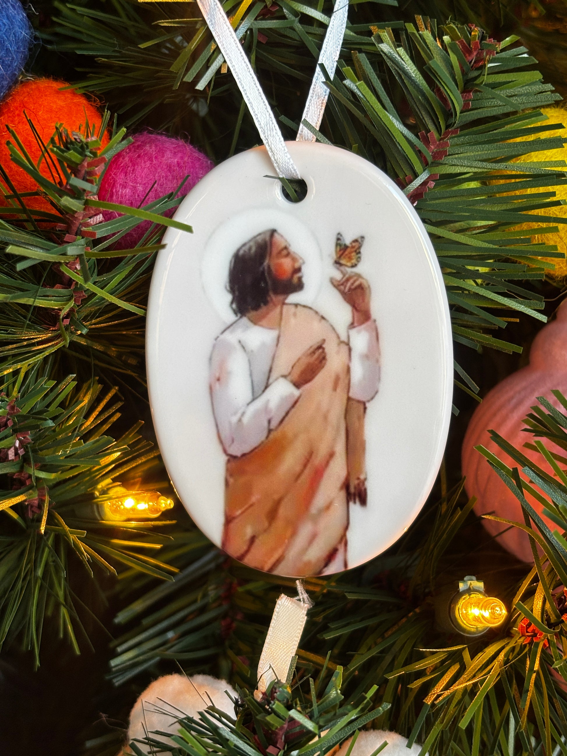 This ornament features my painting titled 'A Heavenly Messenger'. These ornaments are MISPRINTS. These were improperly printed, resulting in a blurry image. The image looks good from a distance but does not meet my standards to sell at full price. For this reason, these ornaments are 50% off.