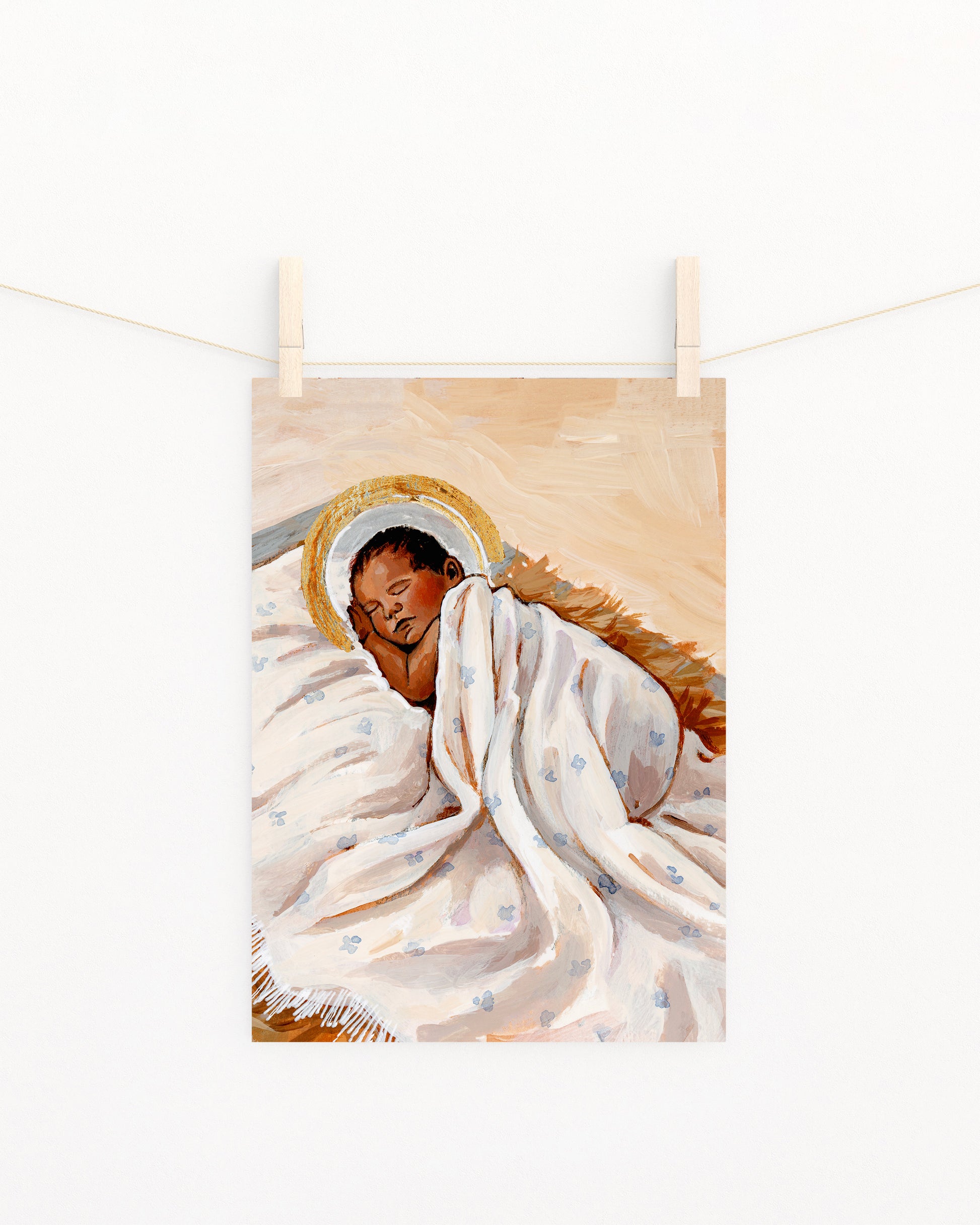 This painting depicts baby Jesus sleeping in the manger. He is covered in a white blanket adorned with forget me not flowers, symbolic of His future sacrifice and how every action He has ever taken is a testament that He never forgets us. This blanket is also a reminder the us to never forget Him. To remember that He is the reason we celebrate Christmas - this sweet baby, who would one day save us all.