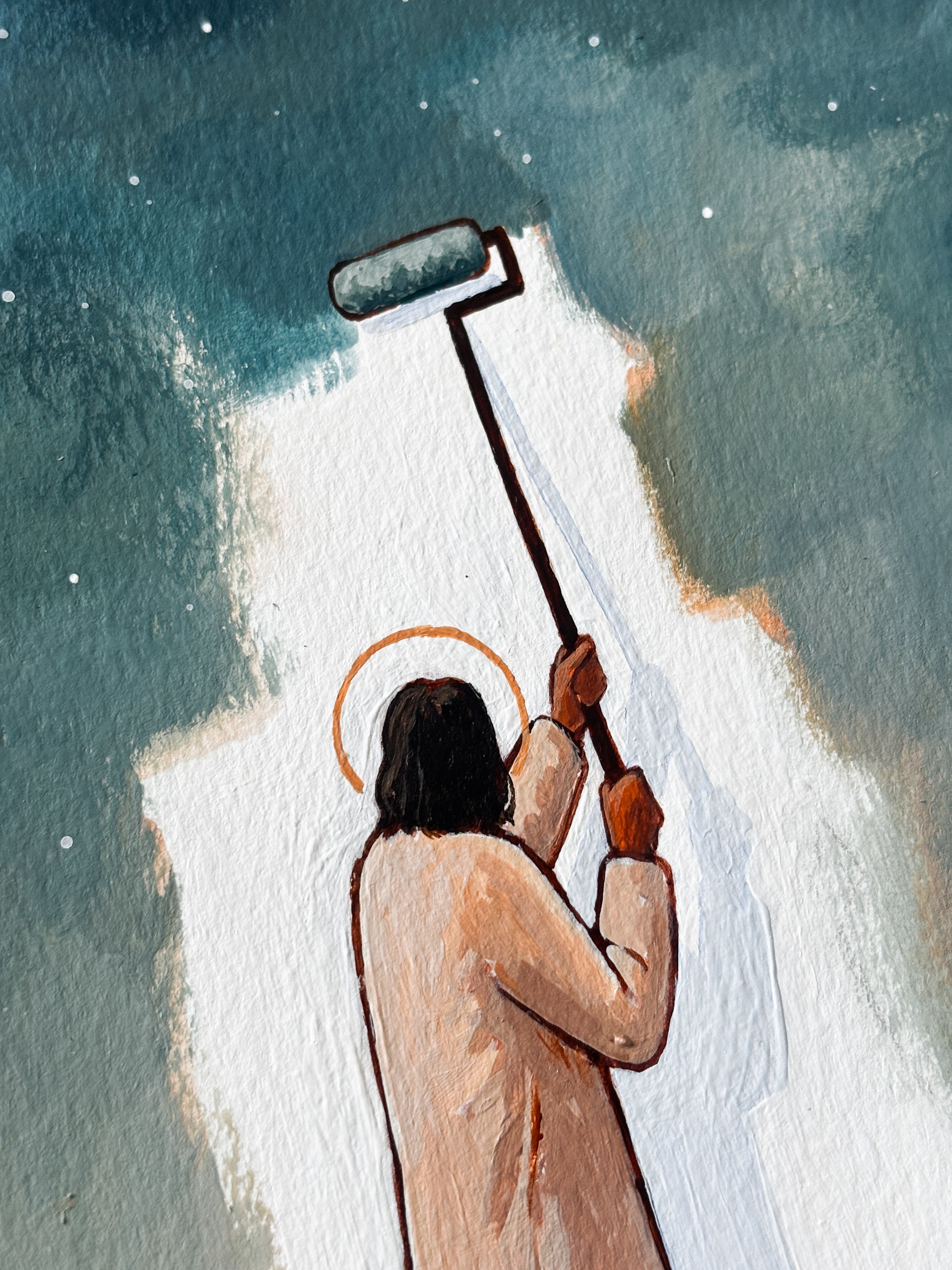 I’ve been working on this painting concept for years and finally was able to bring it to life. If you’ve been here for a while you know I am obsessed with making paintings of the Savior creating. I have painted Him gardening, doing pottery, painting an oil painting, placing stars in the night sky, doing Kintsugi, and more. I love to call Him the master artist, the great creator. I love to imagine Him arranging flowers on the earth, moulding beautiful mountains out of the ground, and painting the sky. Something about this imagery just makes Him feel so real to me. It makes the earth feel so sacred. It helps me to remember that we have the privilege of living among His beautiful creations, and that everything I see and touch and hear is a sign of His power and His love.