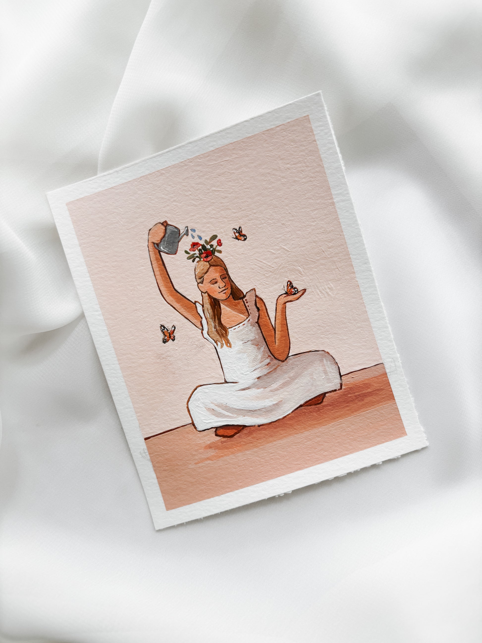 As back to school season starts, I’ve been thinking a lot about the kind of messaging I wish I had been surrounded by as a young girl and teenager. When I look back at that period of my life, I am saddened by how hard I was on my myself. It took me a long time to love who I was, to respect myself in relationships, and to take myself and my dreams seriously. I want to create artwork that helps those younger than me to remember that they are worthy of love and respect. This piece is inspired by that desire. In this painting, a young girl waters her head, which flowers are growing out of. She is surrounded by butterflies, which symbolize transformation and change.