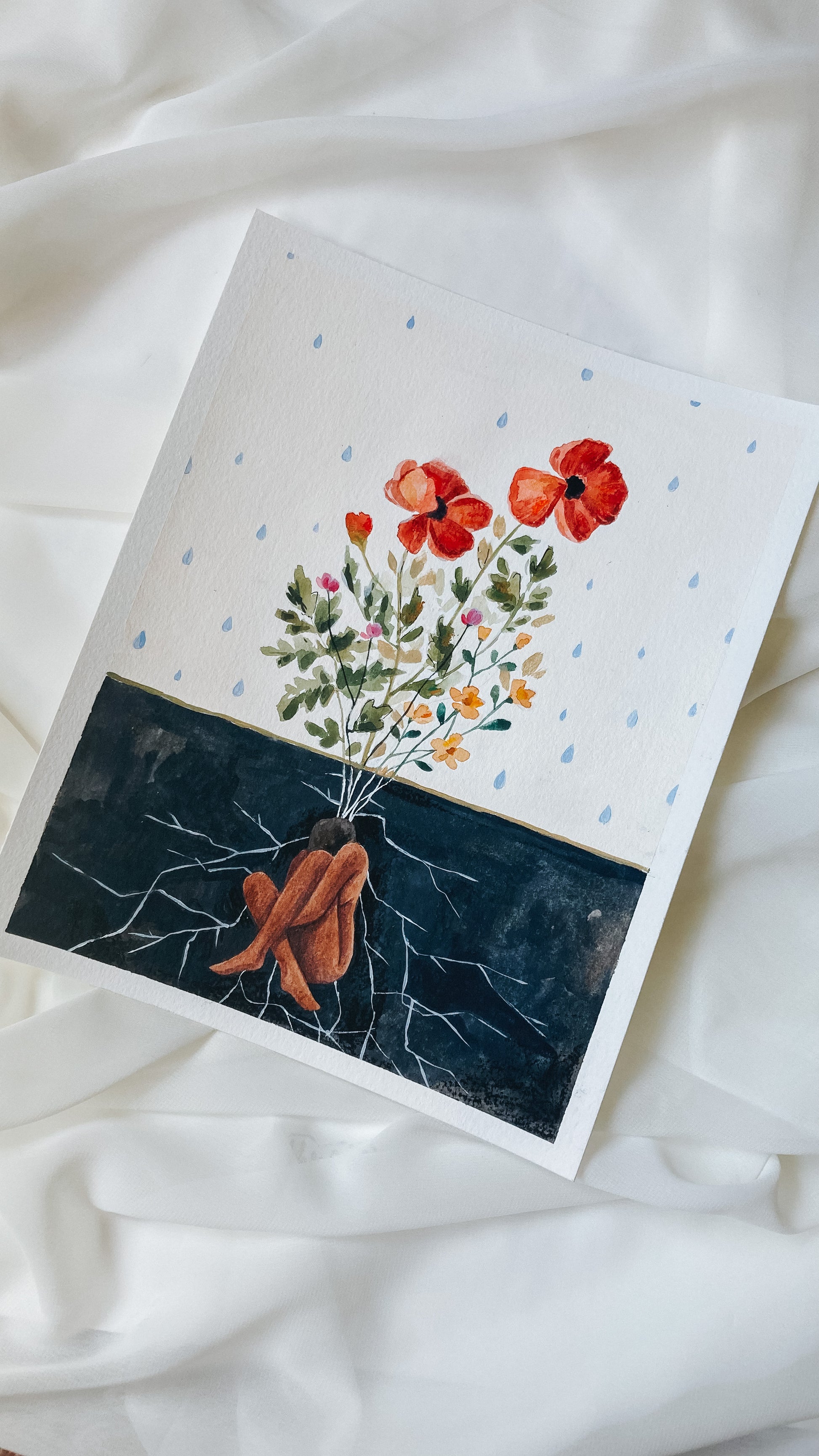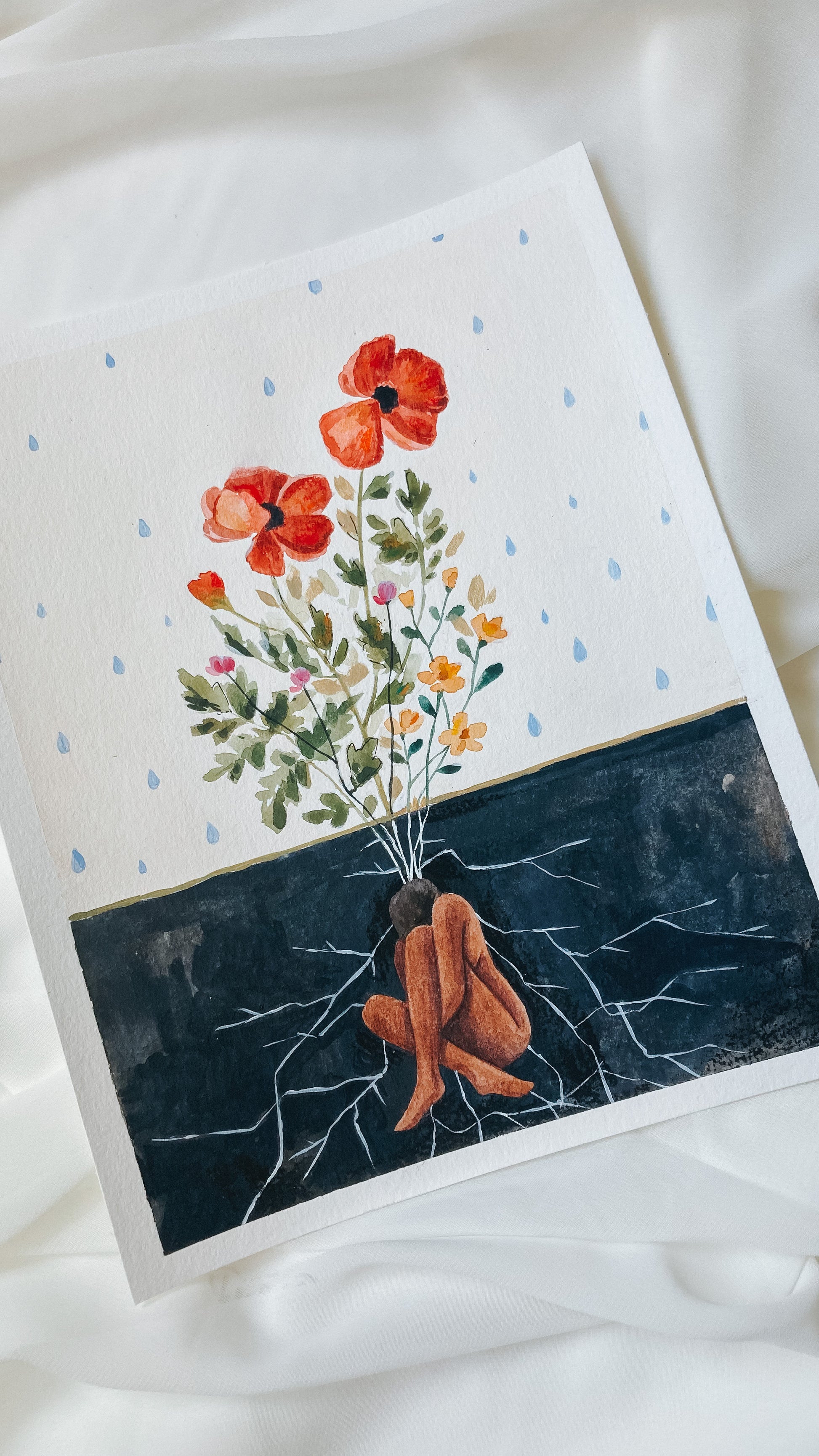 An original painting sized 8x10 inches titled 'If Only She Could See #3'. I have been musing on many things recently. How we see ourselves, our souls and our bodies, how our struggles help us grow and can turn into something beautiful, how the rain can be a blessing, how we compare ourselves to the other flowers around us, how we don’t realize how beautifully we are blooming. If only we could see what everyone around us sees.