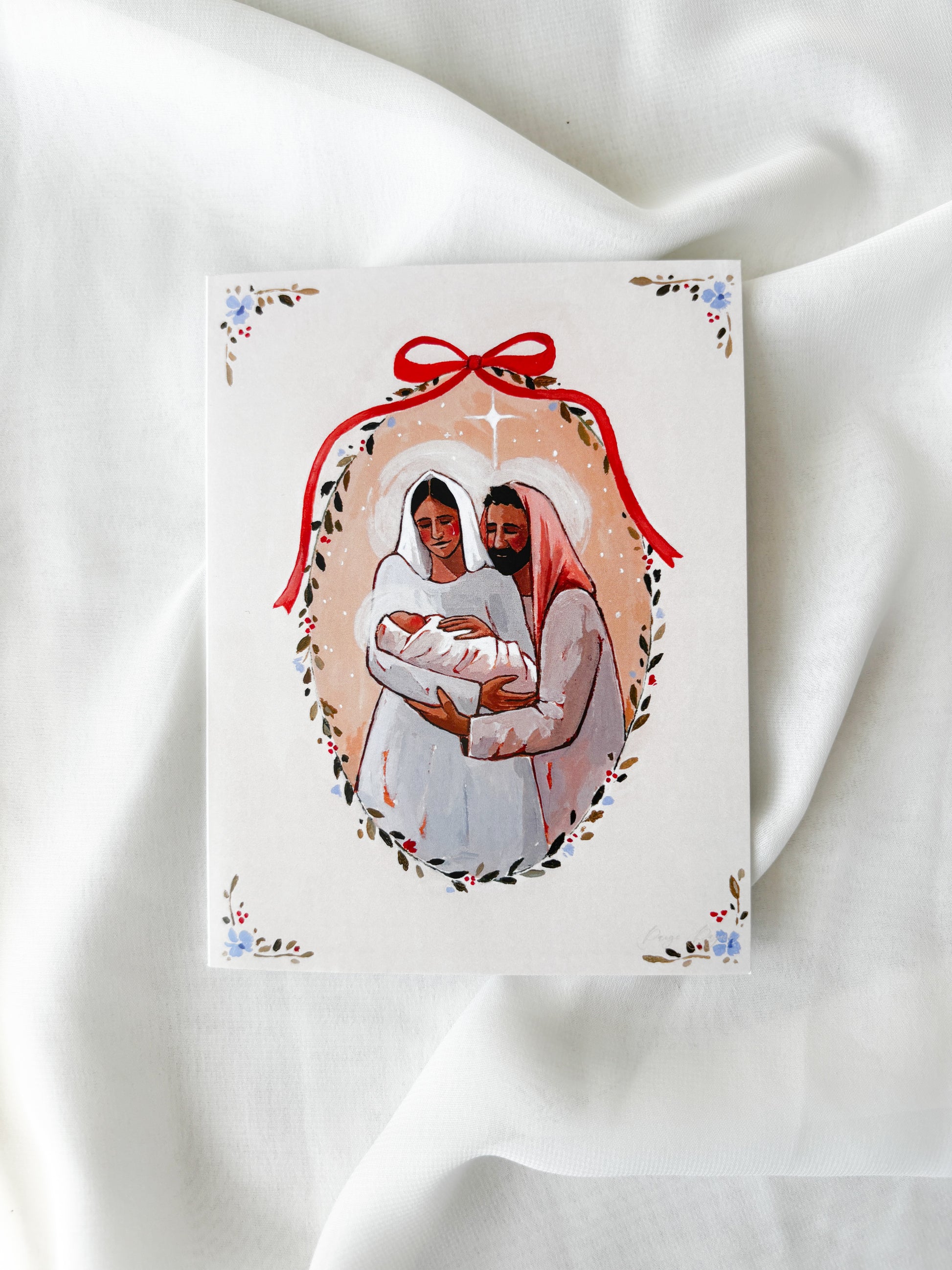 This greeting card features my painting 'Love's Pure Light.' This painting features the Holy Family snuggled together soon after the Savior's birth.