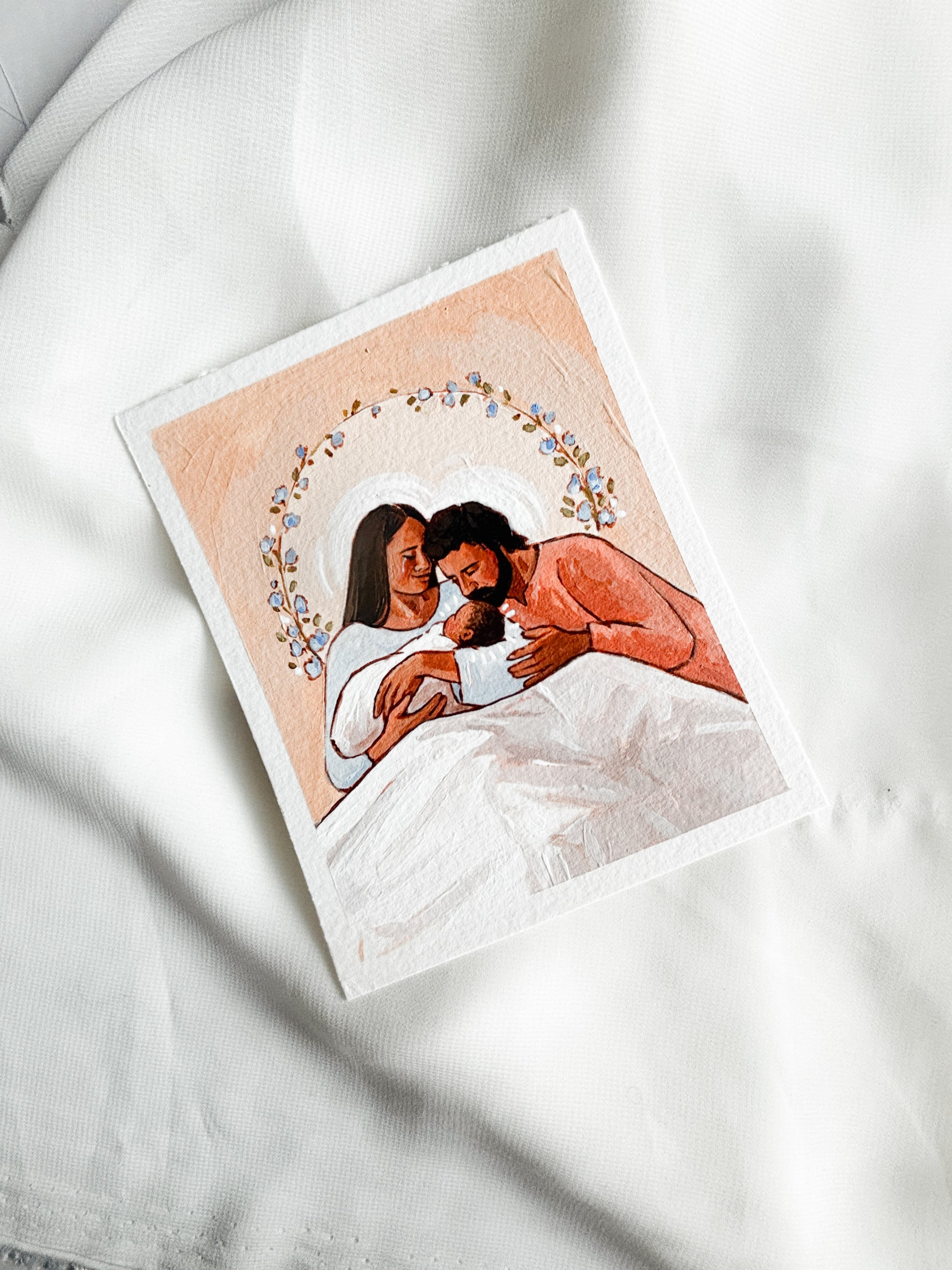 An original painting sized 4x5 inches titled ‘The Holy Family'. This painting is a watercolor and acrylic painting created on professional watercolor paper.